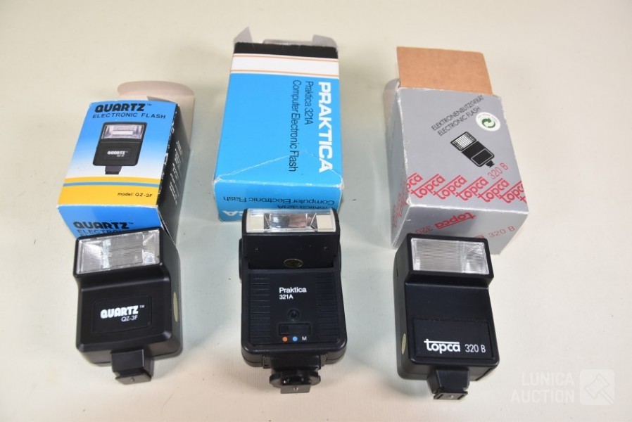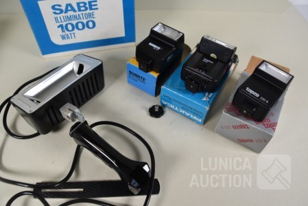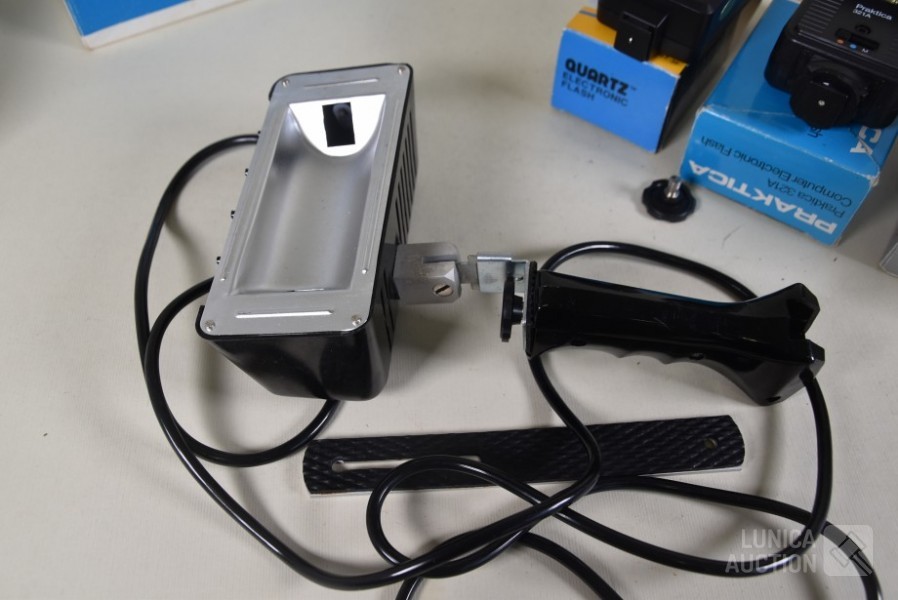 O.a. Flitslamp Quartz QZ-3F; Practika 32 1A; TOPCA 320B; Filmlamp SABE 1000 watt, zonder lamp