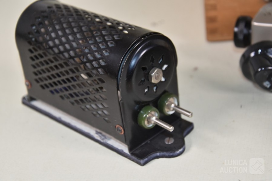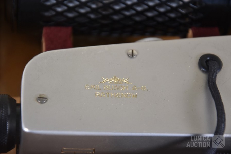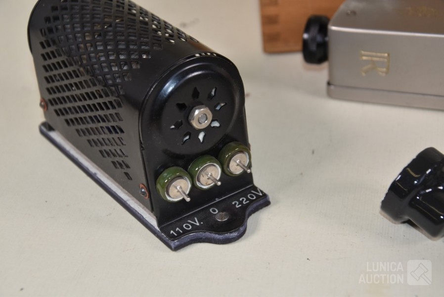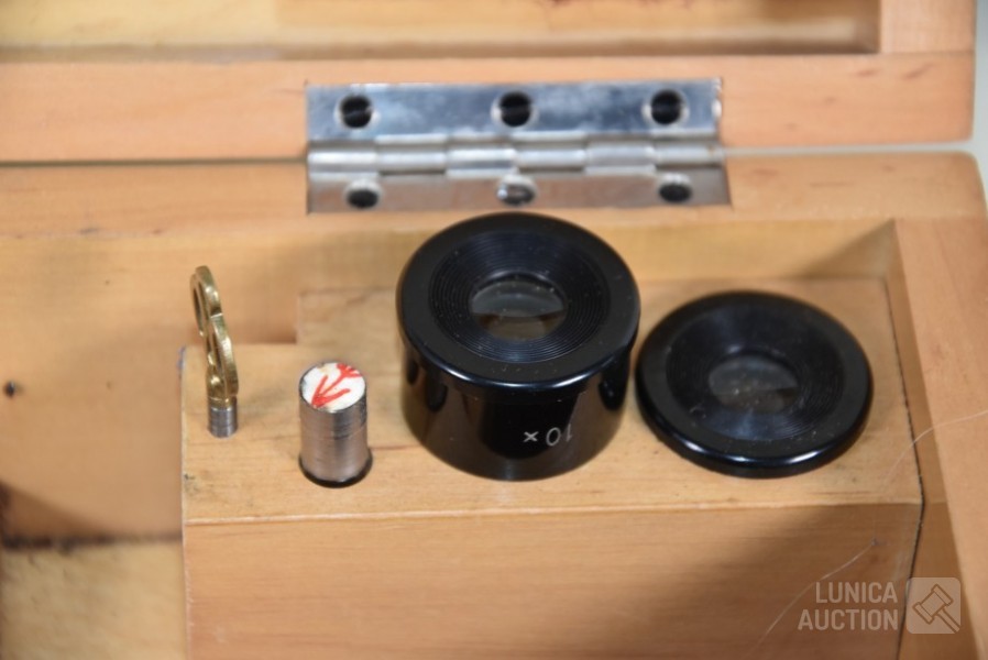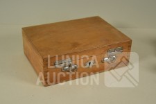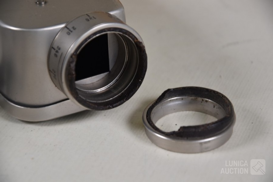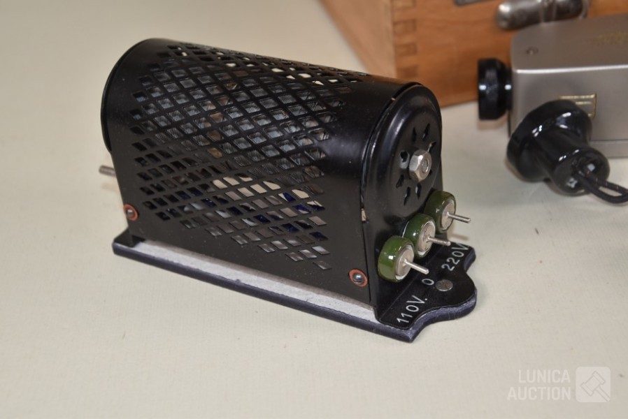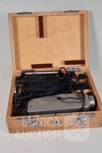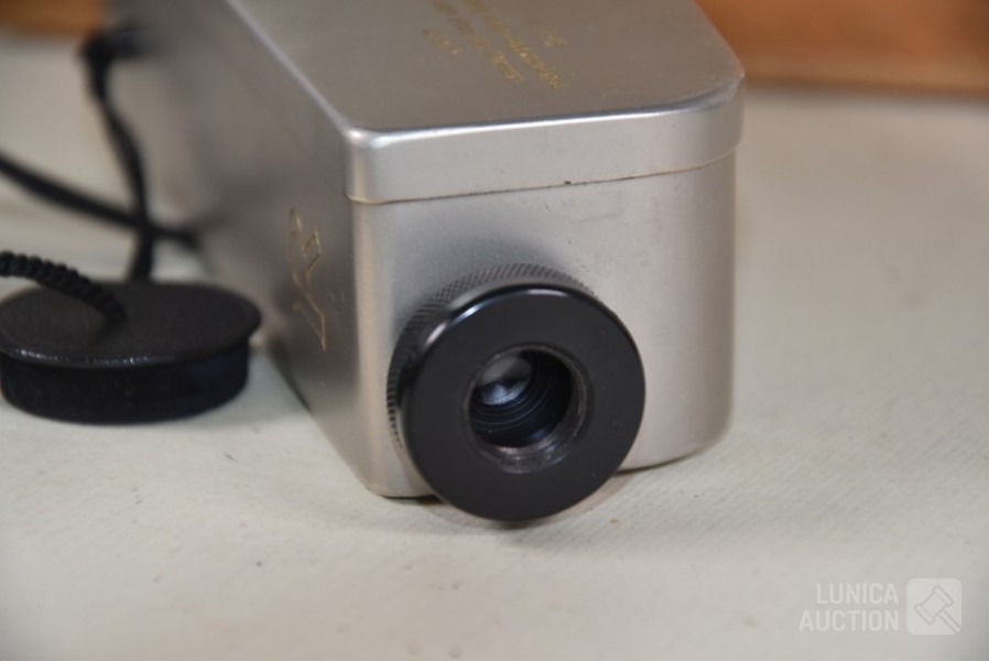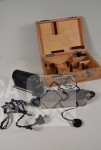 In kist, met diverse toebehoren. Lens aan de voorzijde is defect.