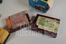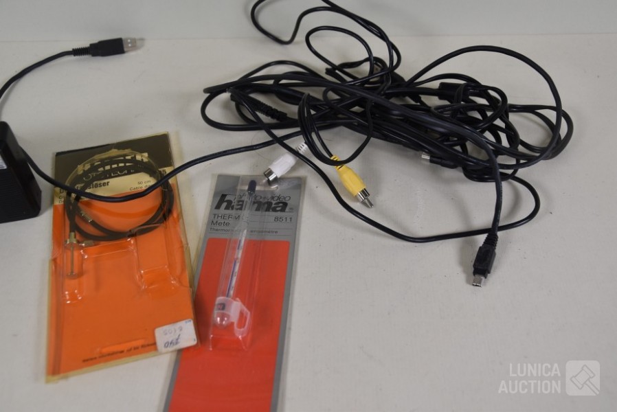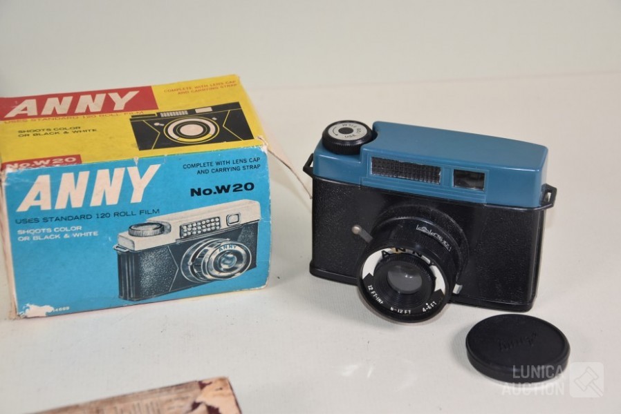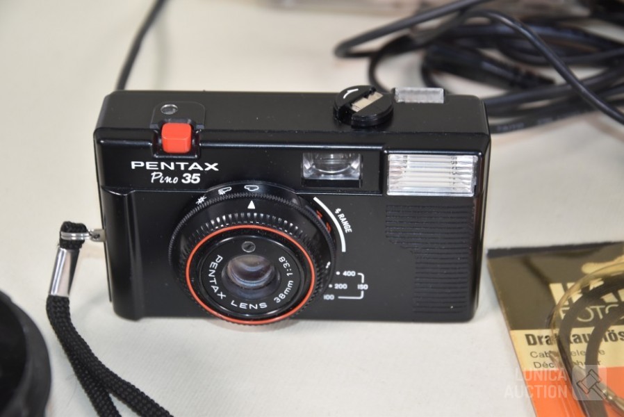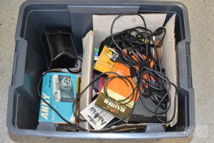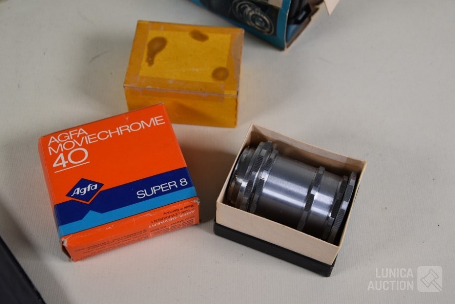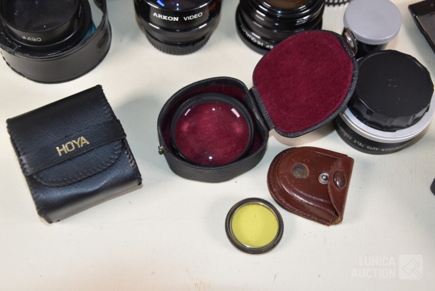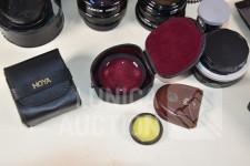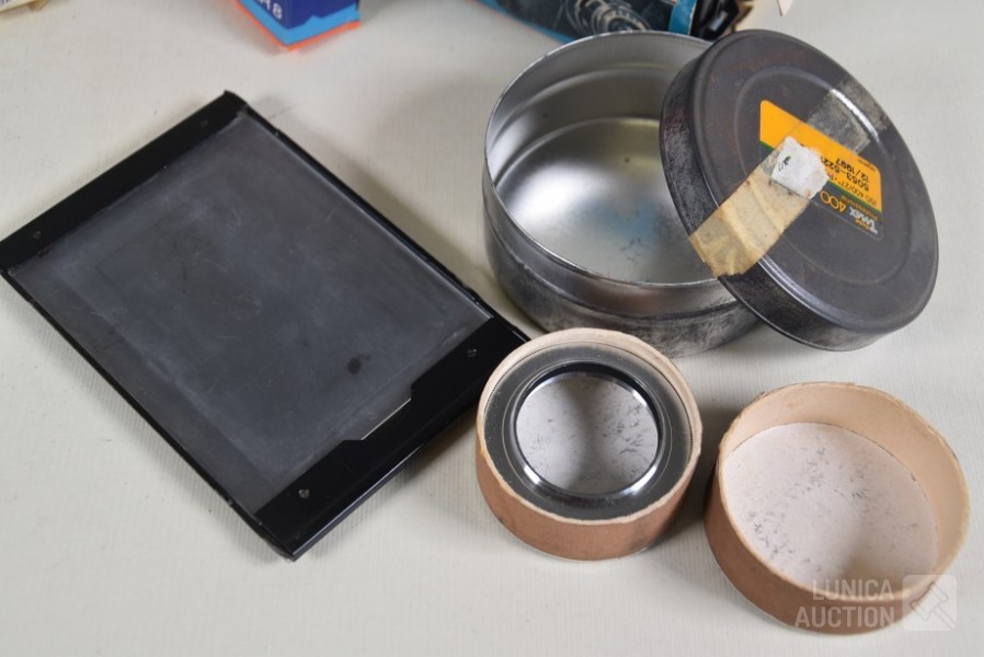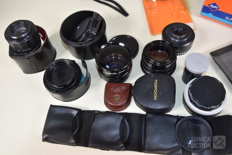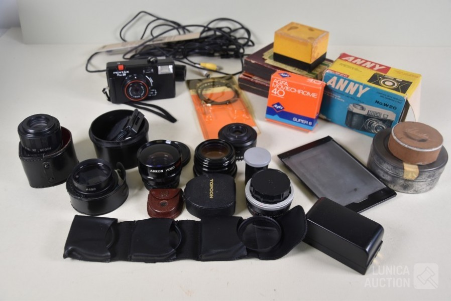 o.a. Lensdoppen; vintage verpakking Agfa chromo platen; diverse fotorolletjes; Diverse filters; Diverse converters; Pentax pino 35 camera; Anny No W20 camera; Hoeklens enz.