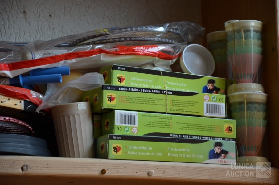 o.a. partij voetballen, tennisballen, tafeltennisballen, tennisrackets, luchtpomp, tollen,enz. Deels in originele verpakking. Afgifte op aanwijzing.
