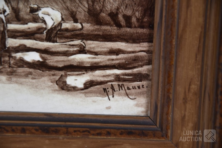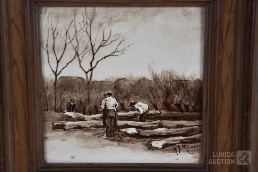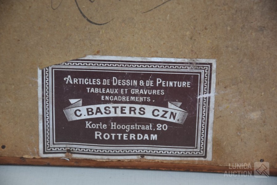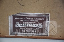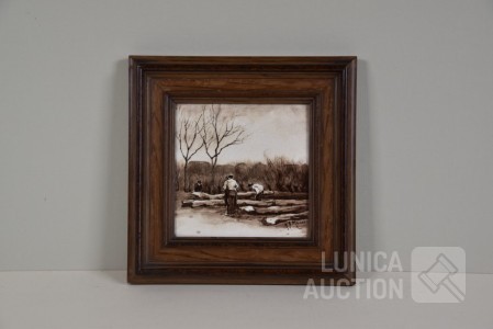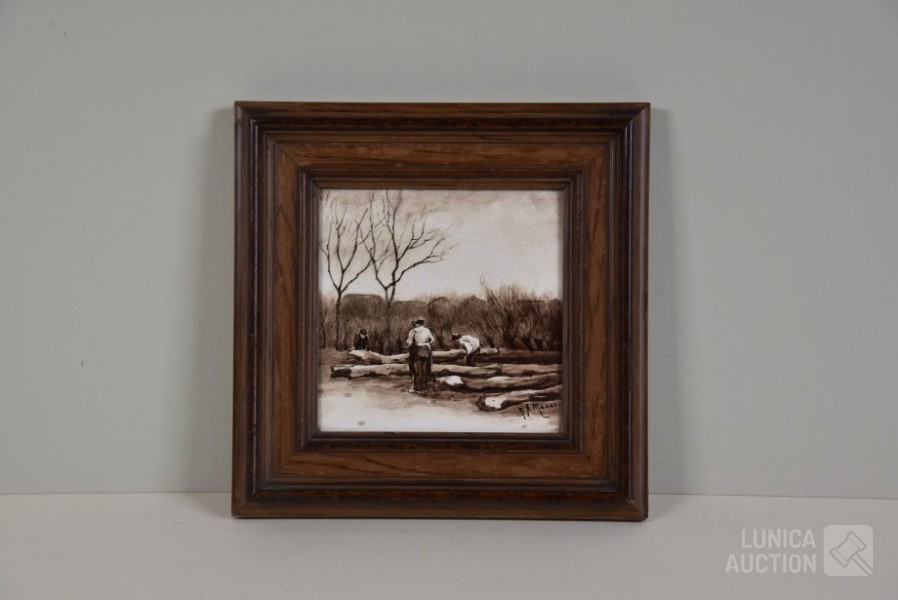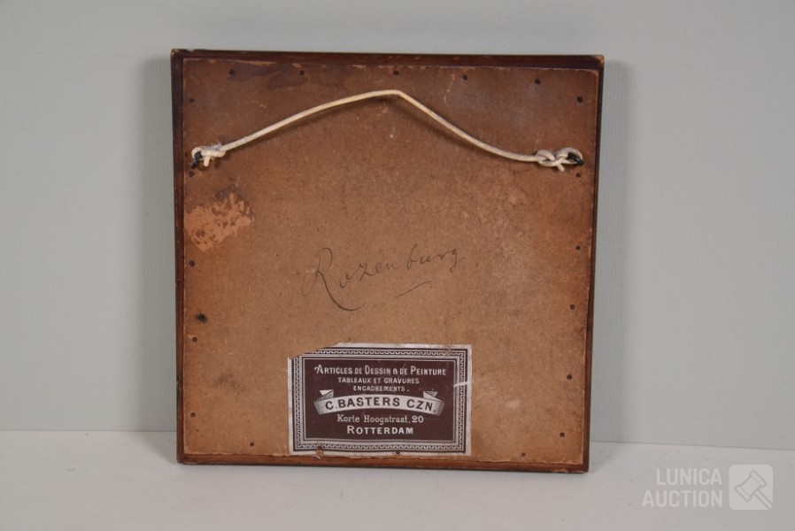 De keramische tegel is toegeschreven aan Rozenburg Den Haag en ingelijst door C Basters, Korte hoogstraat 20 Rotterdam (1893-1895) Afmeting 24x24 cm.