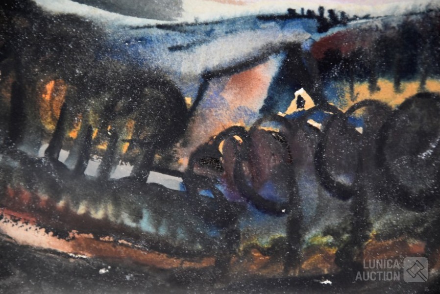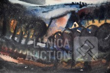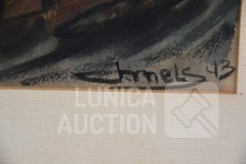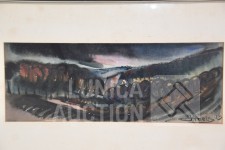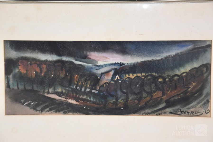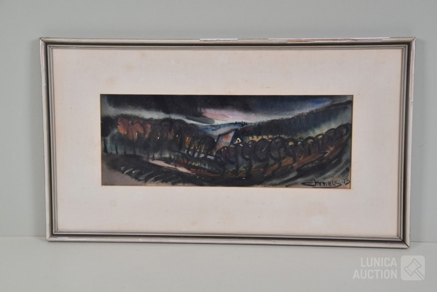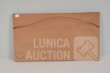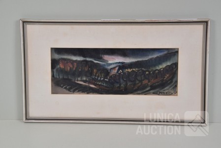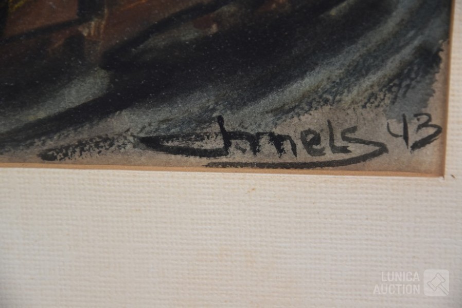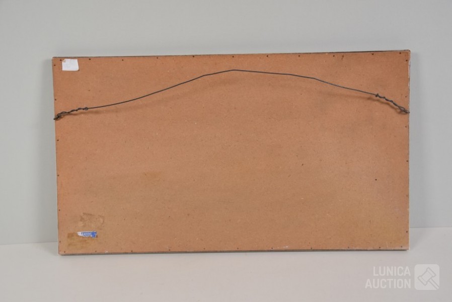 Ingelijst, achter glas. Afmeting 57x32 cm. Lijst licht beschadigd.