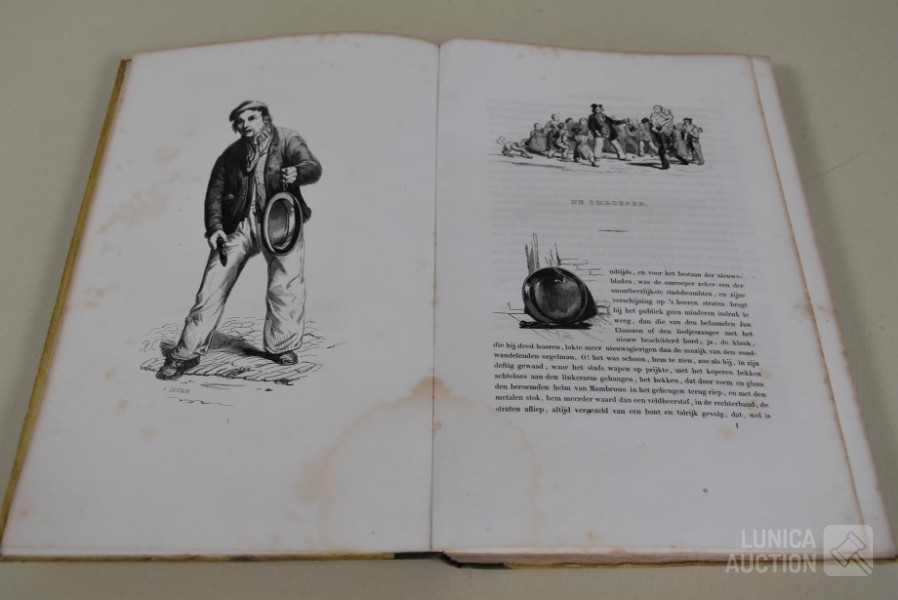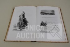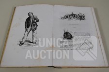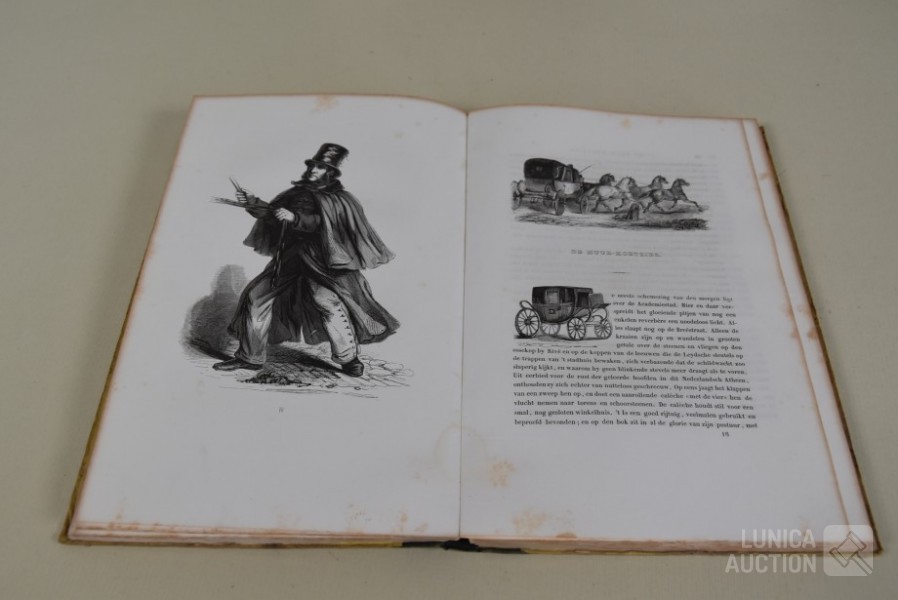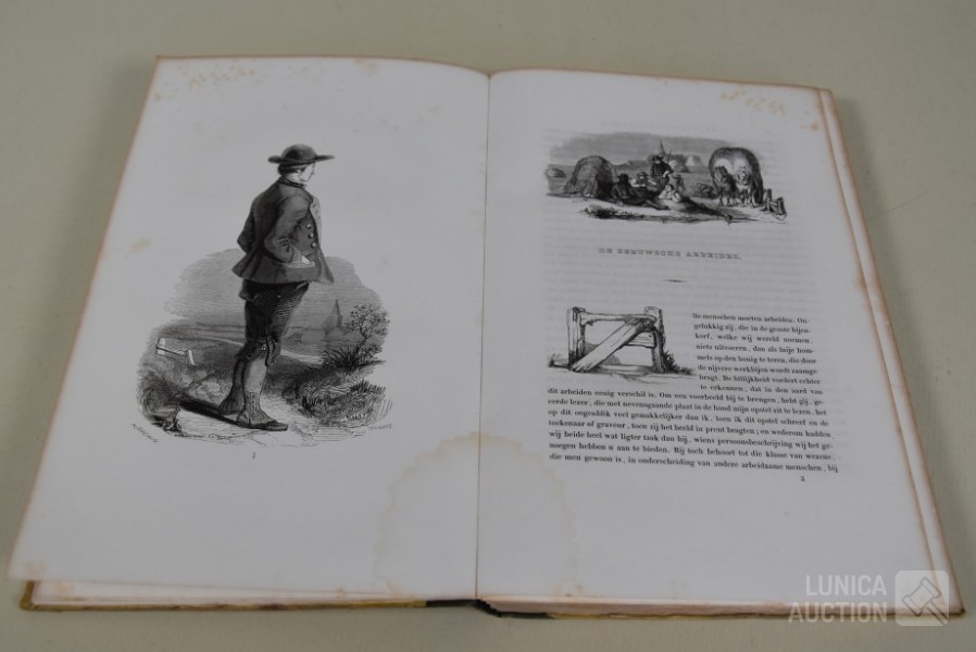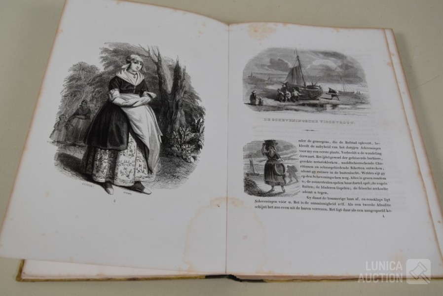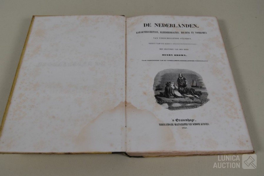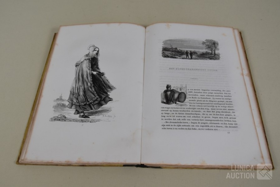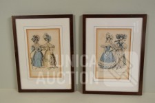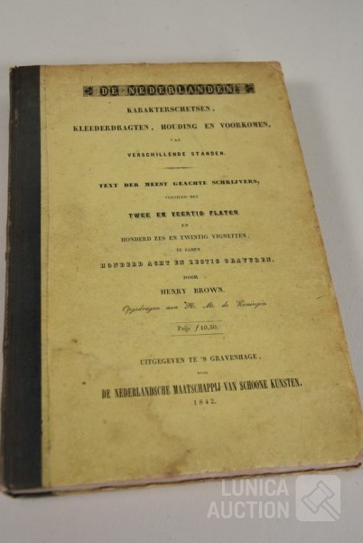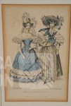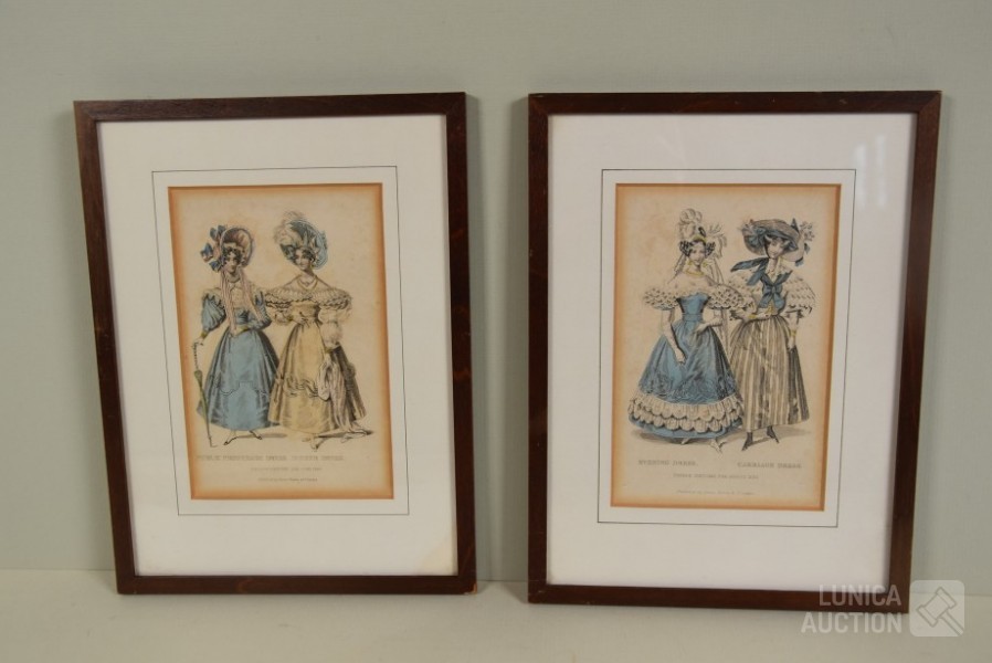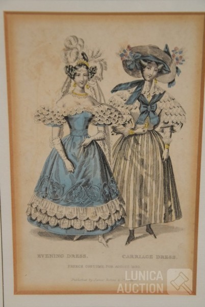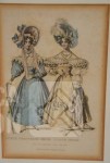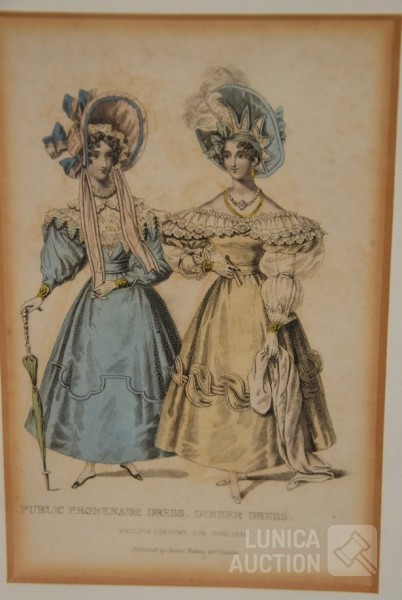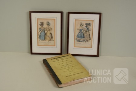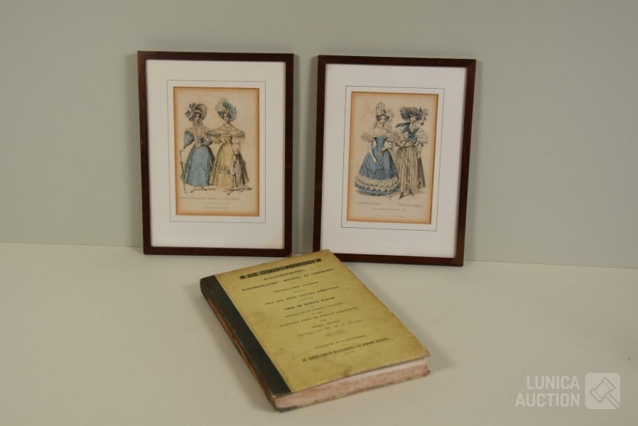 Boek: "kleederdragten, houding en voorkomen" met 42 platen en 126 vignetten. Door Henry Brown. Uitgave. "De Nederlandsche maatschappij van schone kunsten, 1842". 2x gravure "English costume for june 1830" en "French costume for august 1830", uitgave James robins london. Ingelijst, achter glas. Afmeting 20x28 cm