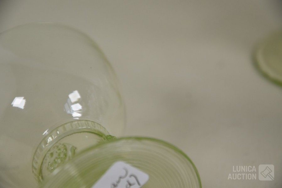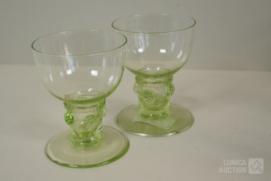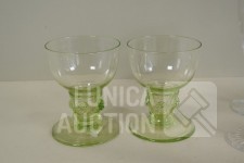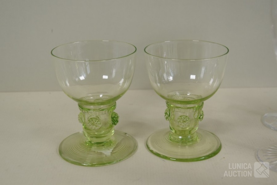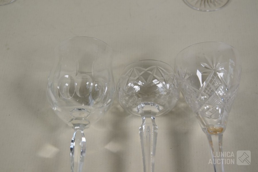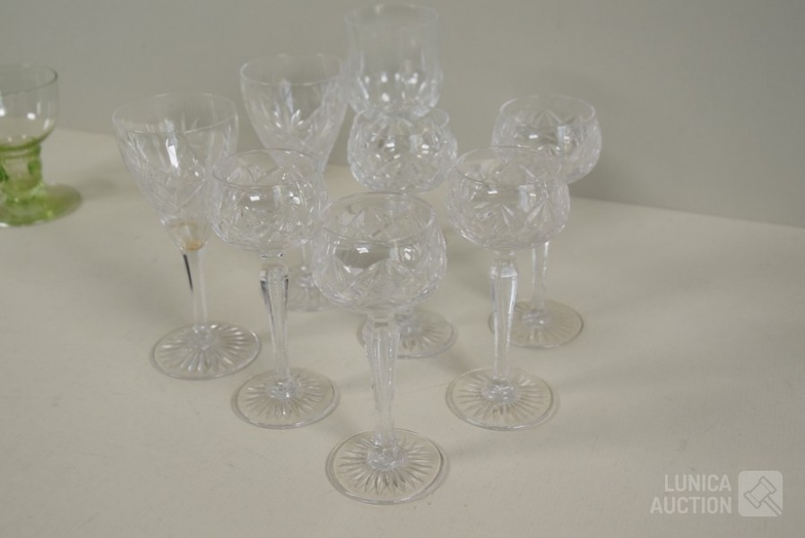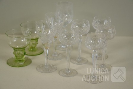 roemer glazen, ca. 1850, hoogte 9 cm., één glas met chip aan onderzijde; Kristalglazen, hoogte 13 cm, 14 cm, en 15 cm. Diverse modellen.