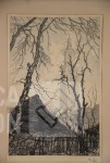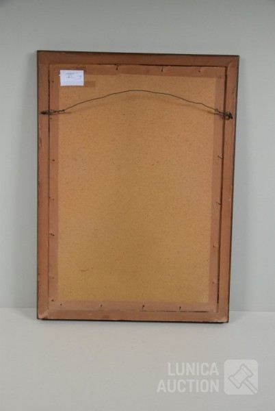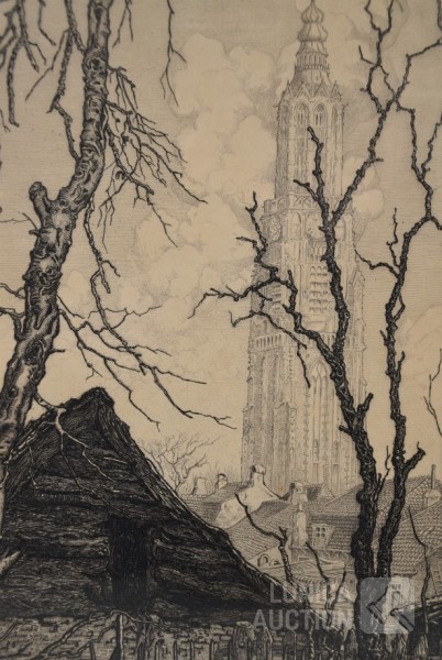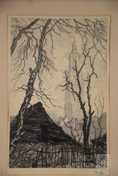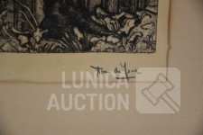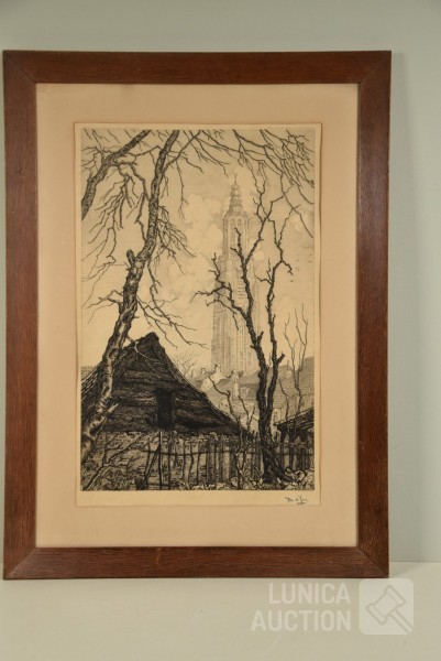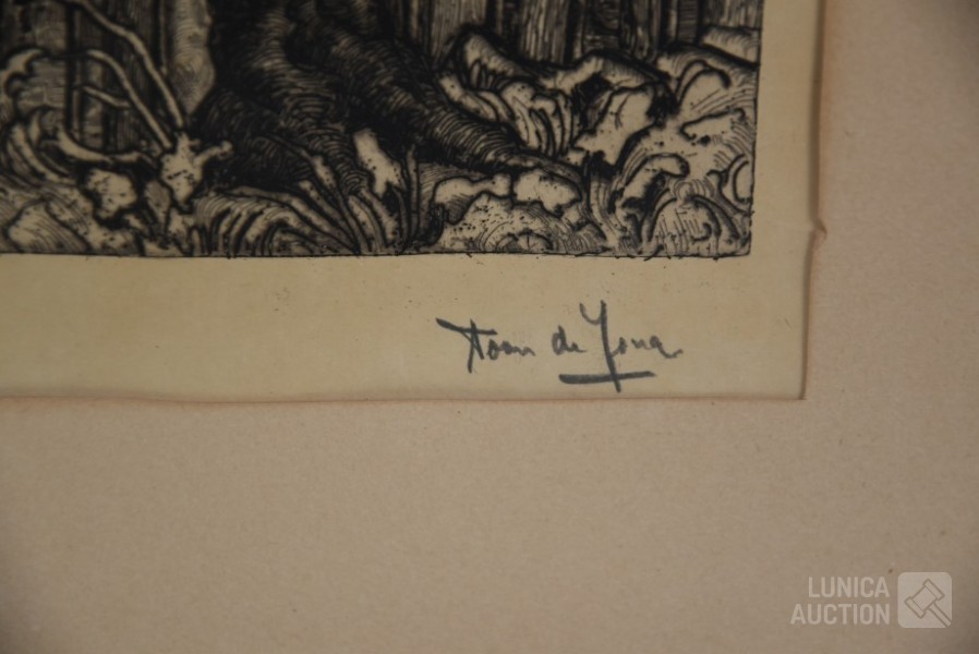 Ets, ingelijst, achter glas. Gesigneerd R.O.. Afmeting 50x68 cm