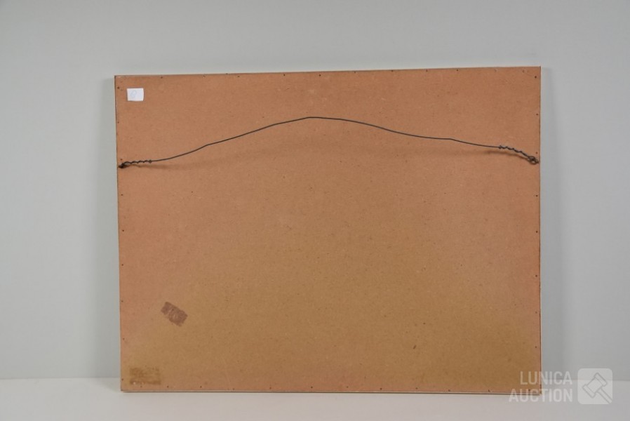 Ingelijst, achter glas. Afmeting 64x48 cm. Lijst licht beschadigd.