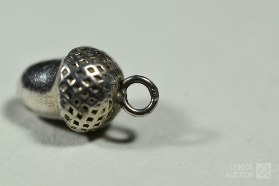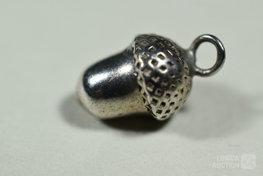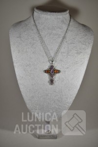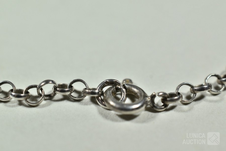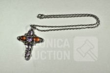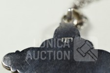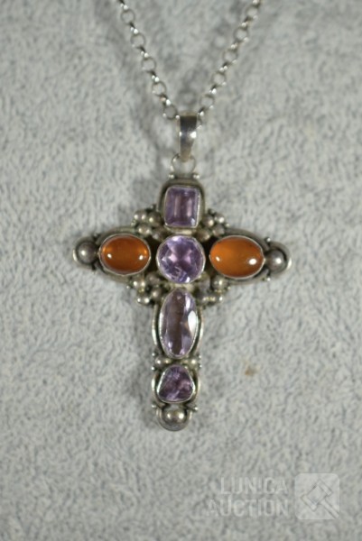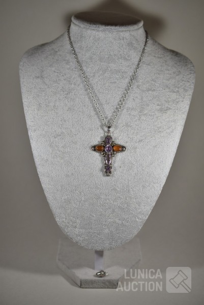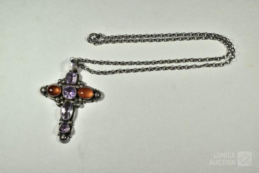 Met inzet van amethist en barnsteen. Gemerkt met 925, afmeting 40x50 mm; Halsketting, gemerkt met 925. Inclusief kleine hanger, in de vorm van een "eikel", hoogte 18 mm, gemerkt met "ZII", 2e gehalte zilver.