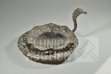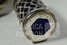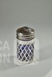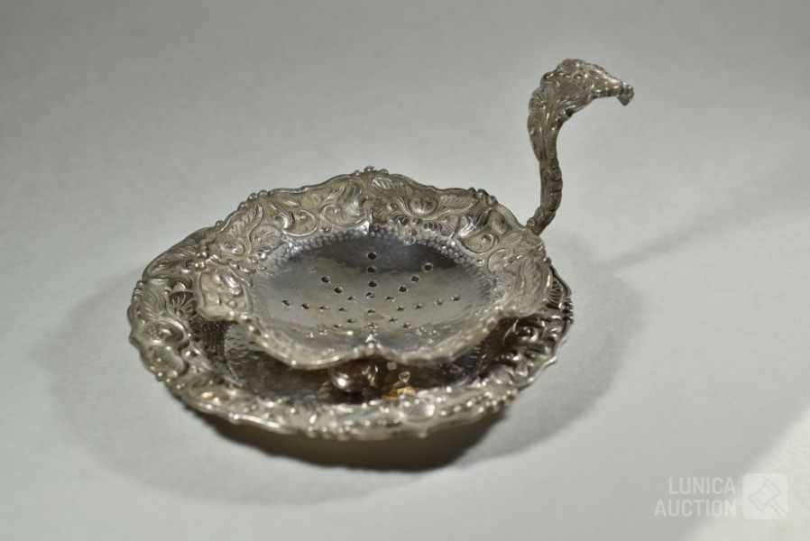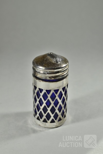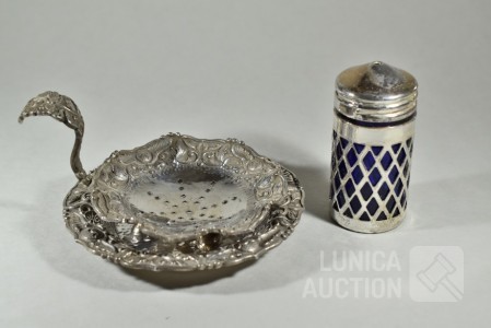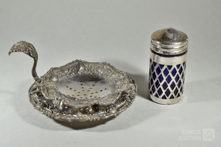 Theezeefje met onderschotel, gemerkt 800 MS, totaal gewicht 103 gram. Afmeting 100x50 mm. ; Inclusief zoutvaatje met kobalt blauw glazen binnenzijde, hoogte 70 mm.