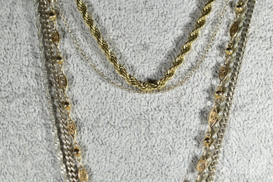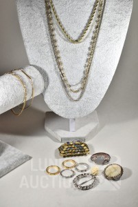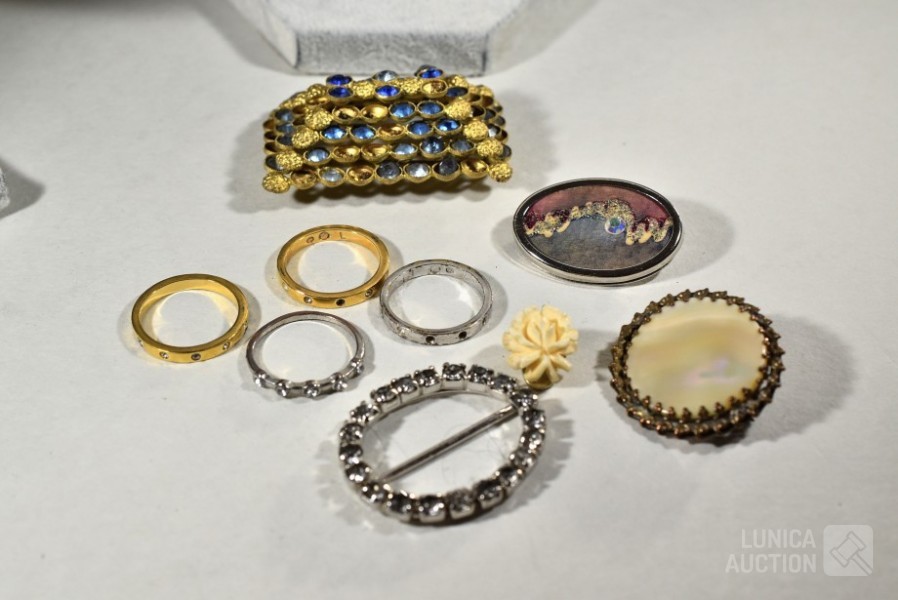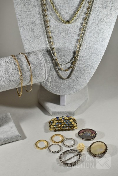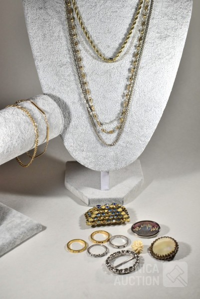 O.a. diverse halskettingen, broches en ringen. Één armbandje is 8K.