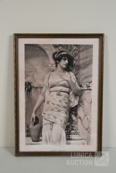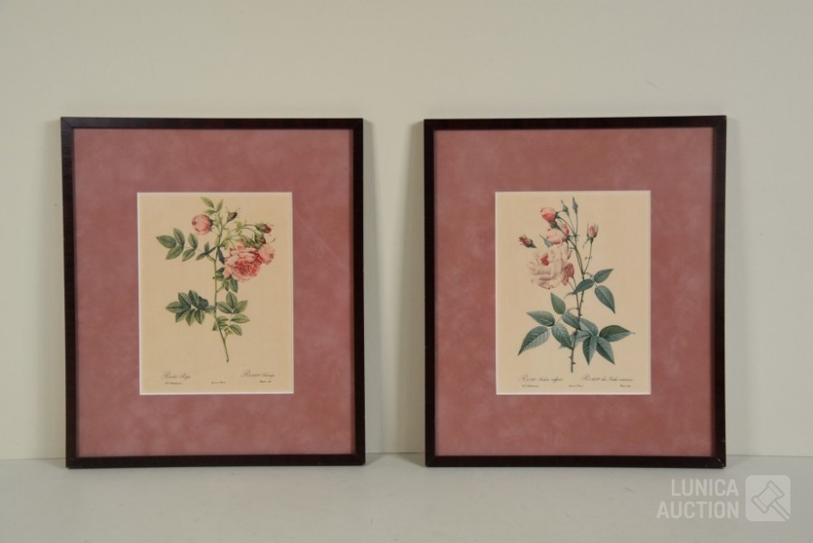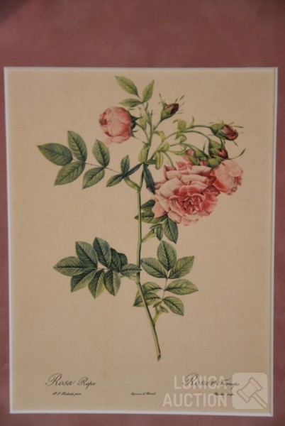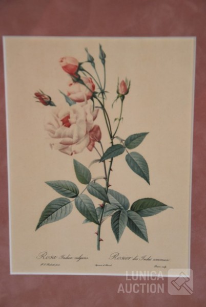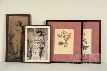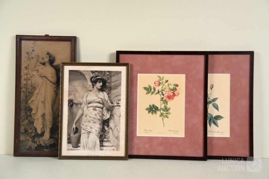 Ingelijst, achter glas, o.a. 2x "roos", druk PJ Redoute, " afmeting 30x35 cm; "vrouw met kruik", J.W. Godward afmeting 23x30 cm.; "vrouw tussen bloemen", E Lappiere, afmeting 20x38 cm.
