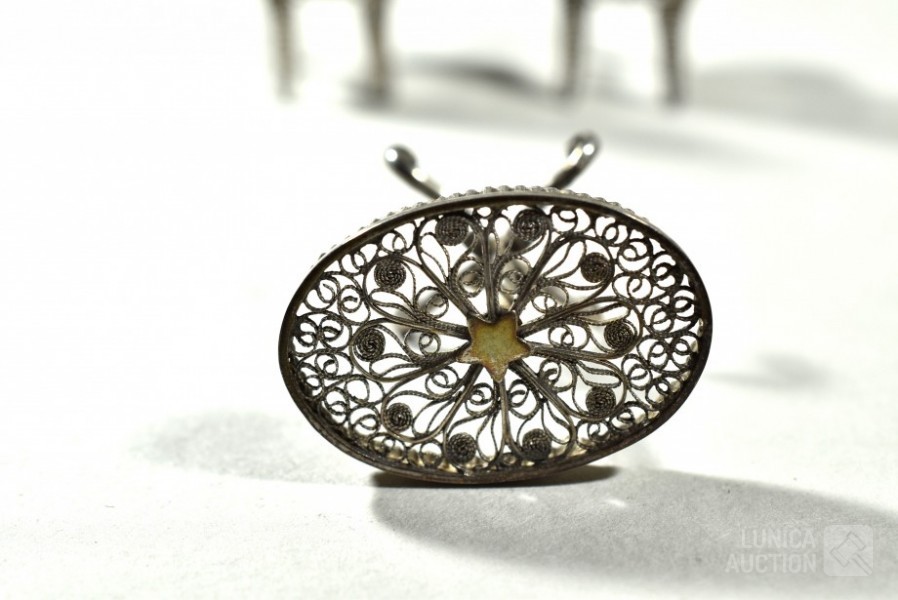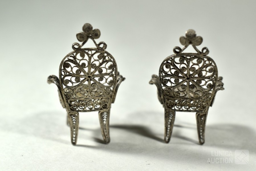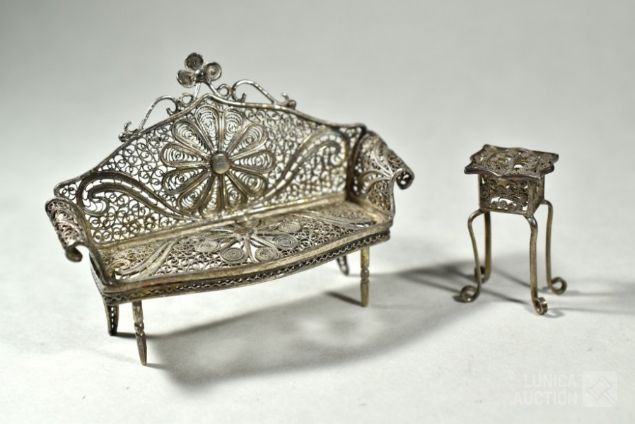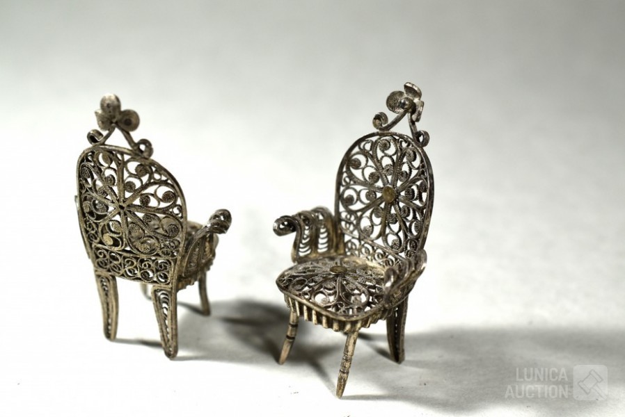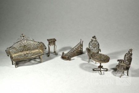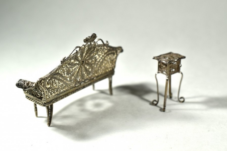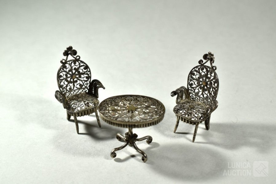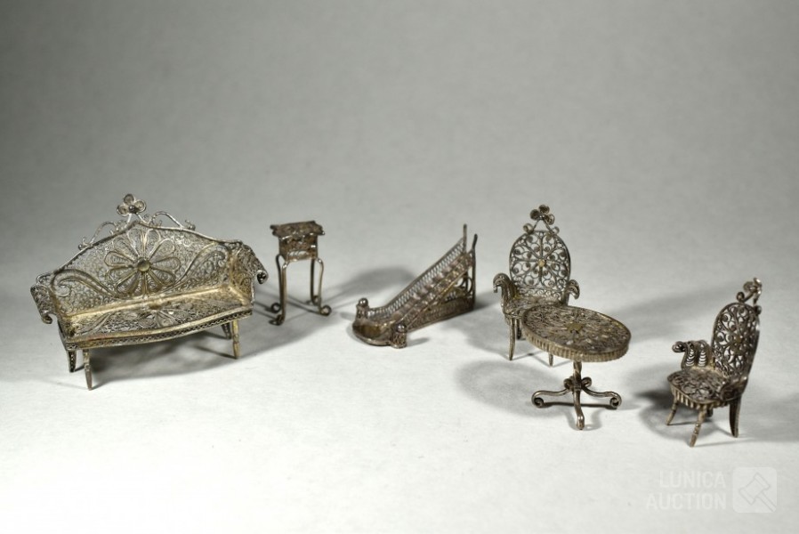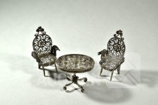 Miniatuur meubeltjes, niet gemerkt. Hoogte variërend van 25 mm tot 50 mm. Totaal gewicht ca. 33 gram.