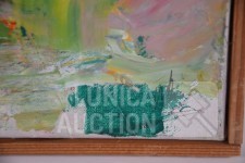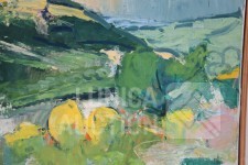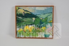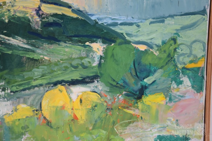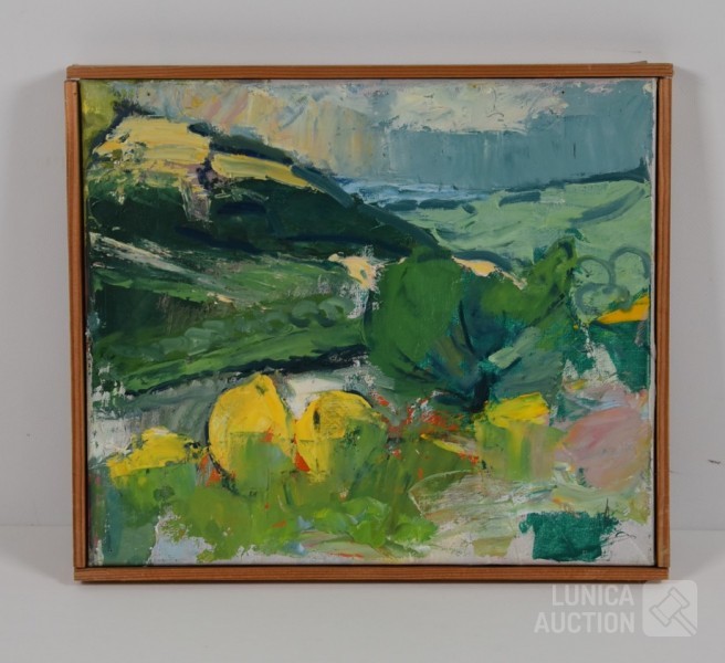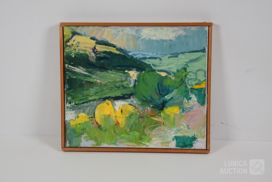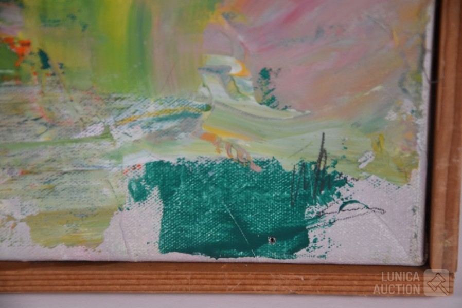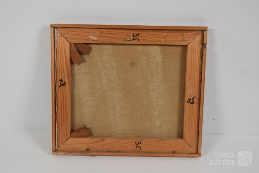 Olieverf op doek, houten latjes als afwerking , afmeting 37x33 cm. Gesigneerd R.O.