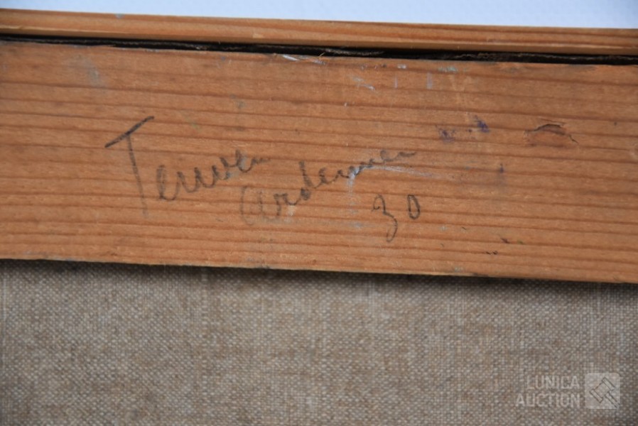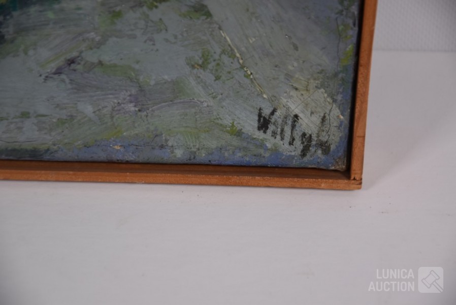 Olieverf op doek, houten latjes als afwerking , afmeting 50x46 cm. Gesigneerd R.O.