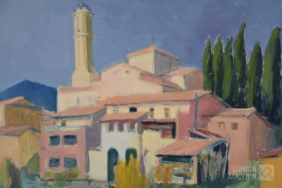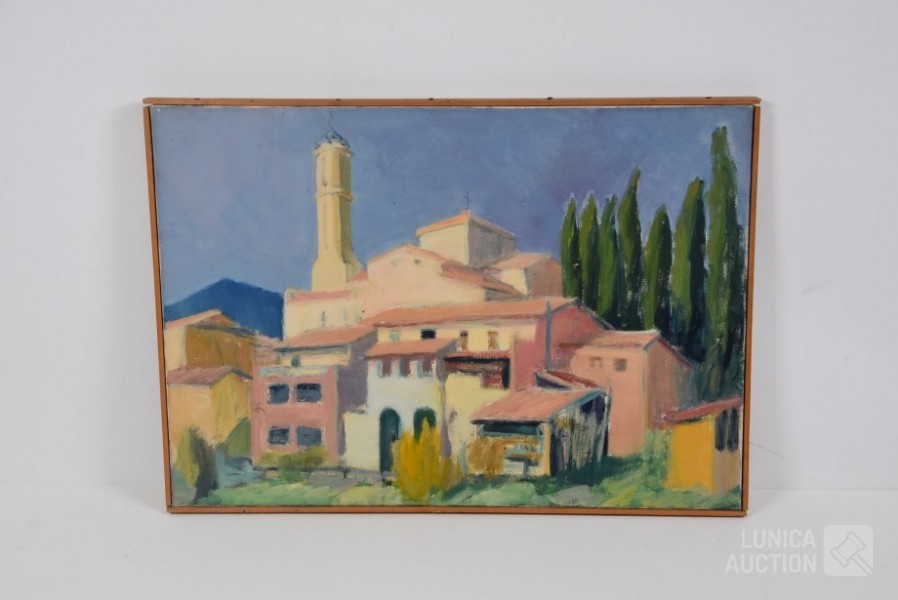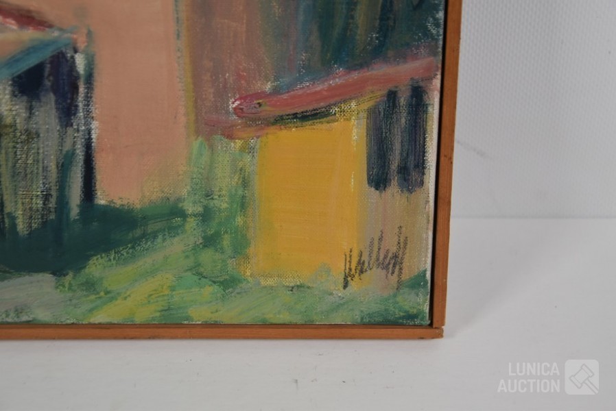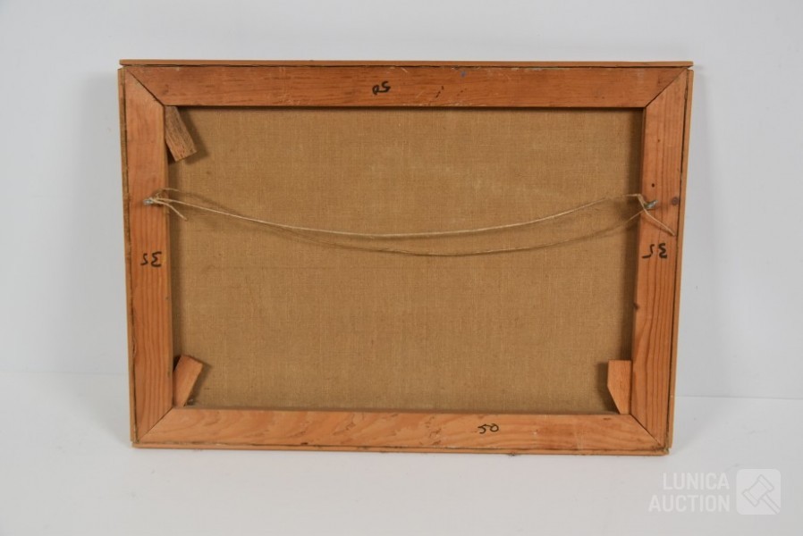Olieverf op doek, houten latjes als afwerking , afmeting 50x36 cm. Gesigneerd R.O.