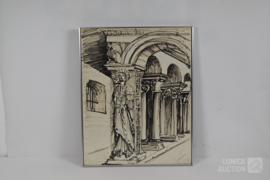 tekening op papier, ingelijst achter glas, gesigneerd R.O. Afmeting 40x50 cm