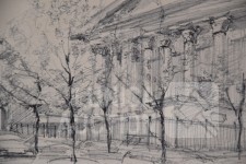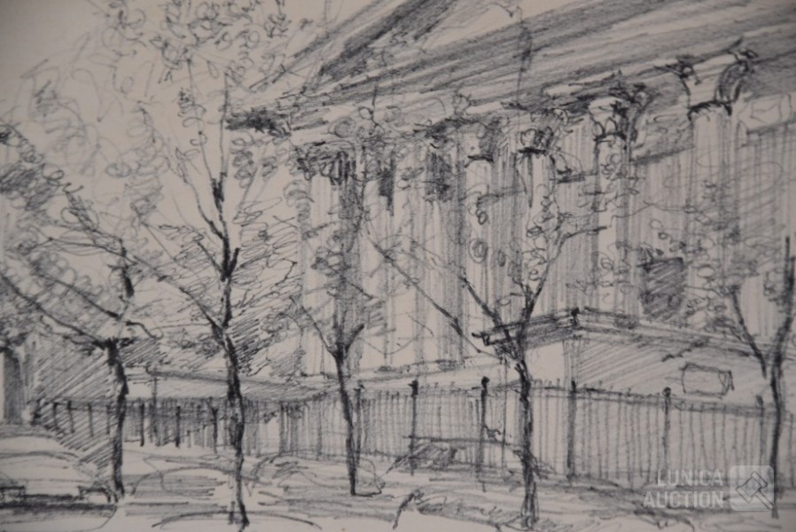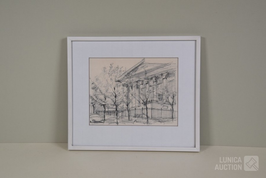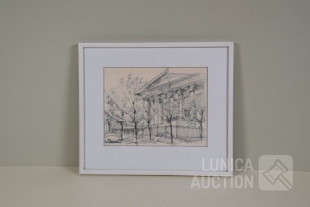 Op papier, ingelijst, achter glas. Afmeting 35x30 cm. Niet gesigneerd.