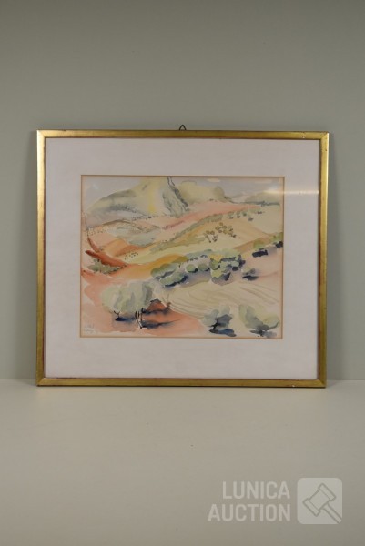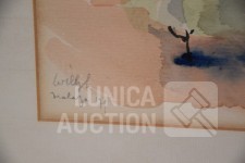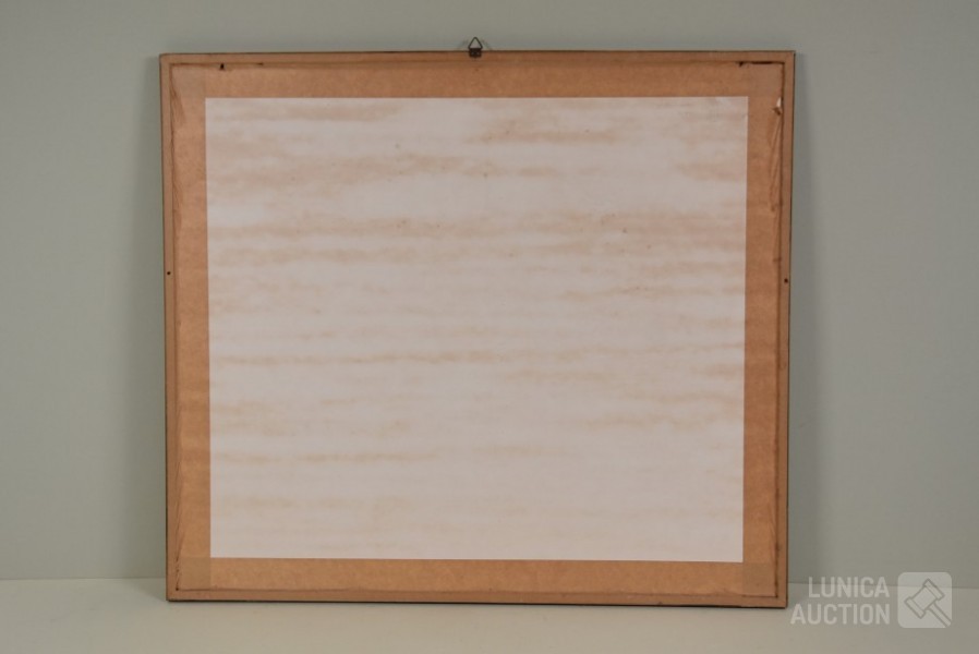 Op papier, ingelijst, achter glas. Afmeting 57x50 cm. Gesigneerd L.O.