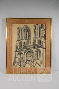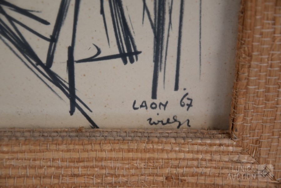 Op papier, ingelijst, achter glas. Afmeting 65x80 cm. Gesigneerd R.O.