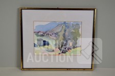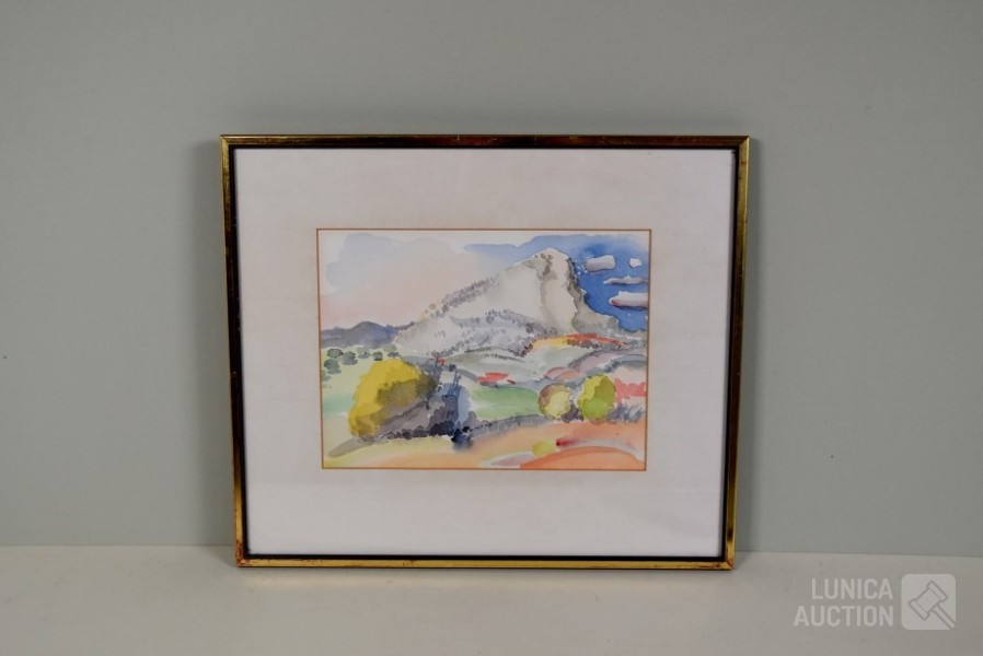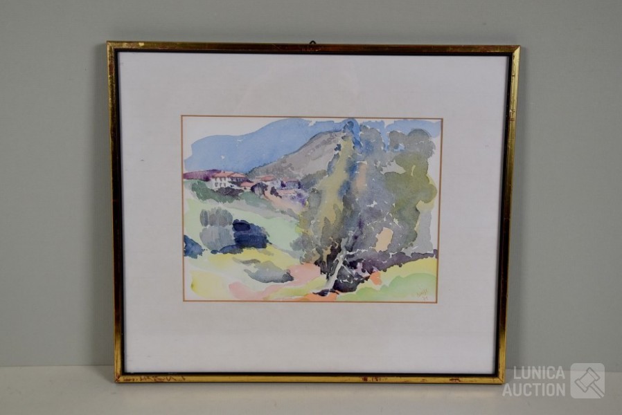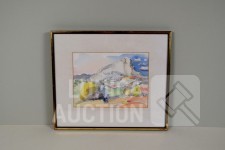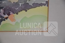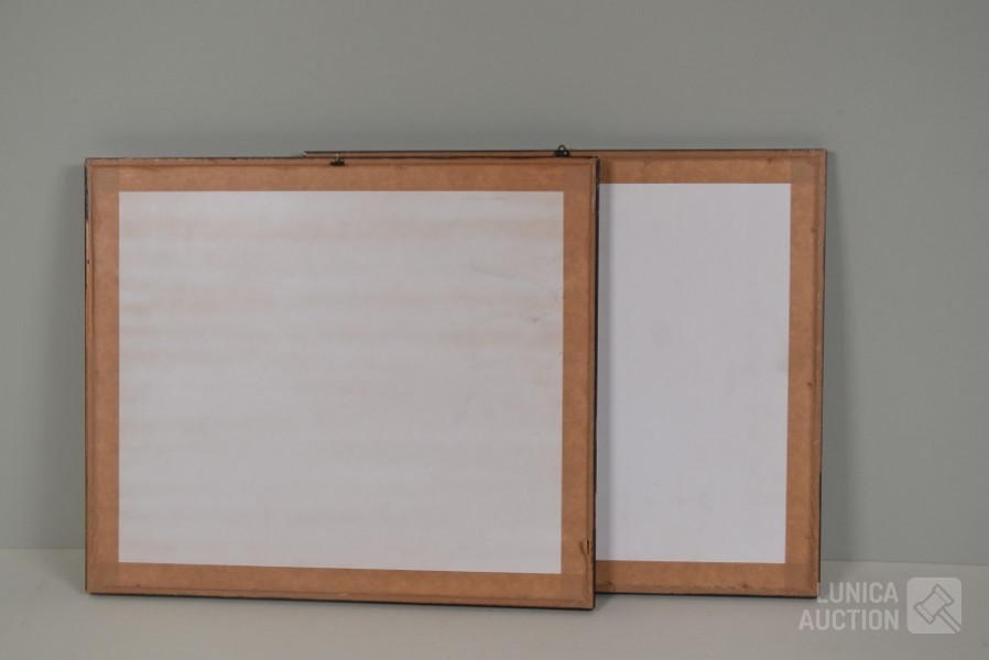 Op papier, ingelijst, achter glas. Afmeting 38x33 cm. Één kunstwerk gesigneerd R.O.