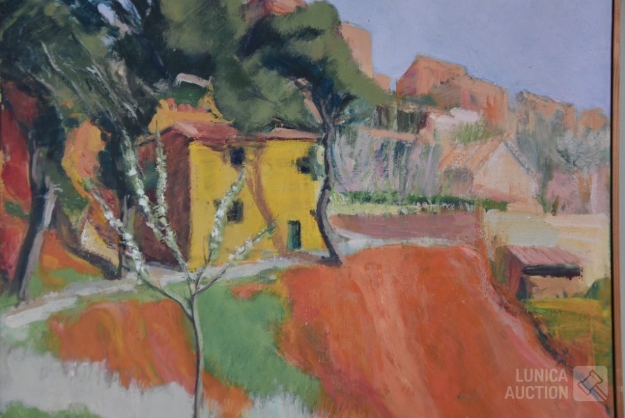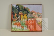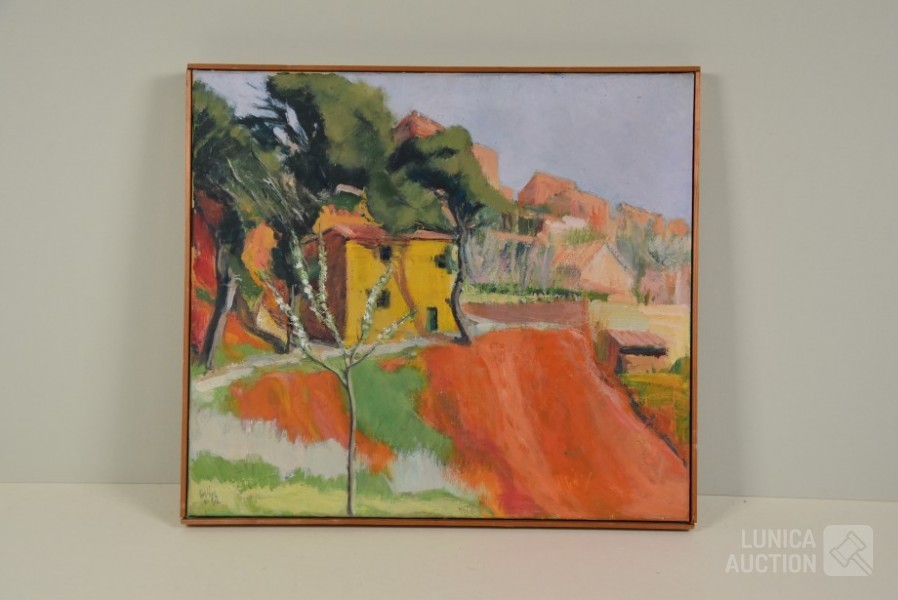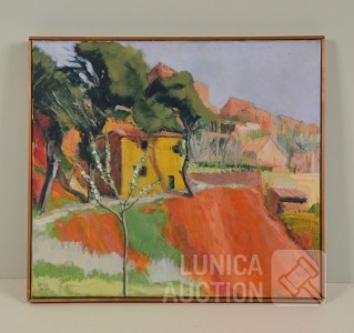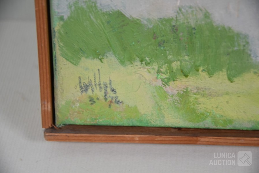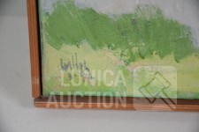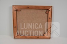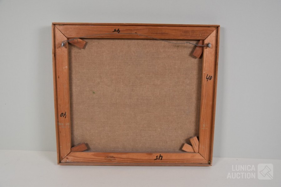 1942, Olieverf op doek, houten latjes als afwerking , afmeting 46x41 cm. Gesigneerd L.O.