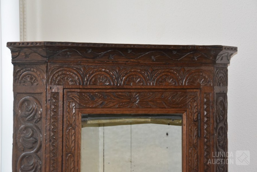 19e eeuws, kast is 2-delig, 3 legplanken, afmeting muurzijde 46 cm, hoogte 163 cm. Onderstel van kast is licht instabiel. Inhoud van kast niet inbegrepen.