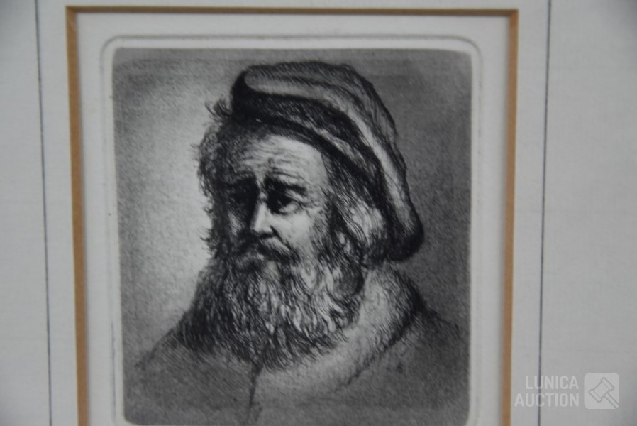 voorstelling Rembrandt; oplage 15/80, ingelijst, achter glas. Afmeting 17x19 cm